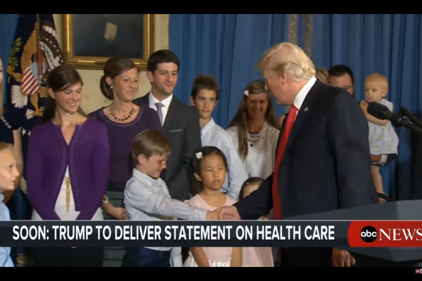 记者会上,特朗普由副总统彭斯介绍出场,而站在他们的身后还站着一群自称是“奥巴马健保受害者”的民众。特朗普一出场,就十分亲切的蹲下和一名白人小男孩握手,然而他却跳过站在这名男孩旁的两名亚裔小女孩,和另一名对他伸出手的白人男孩握手,接着又和第三个白人男孩握手。