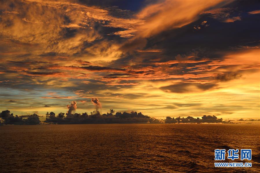 8月10日,我国新一代远洋综合科考船“科学”号在西太平洋行驶途中,遇到金色海上晚霞,景色壮丽。 新华社记者 张旭东 摄