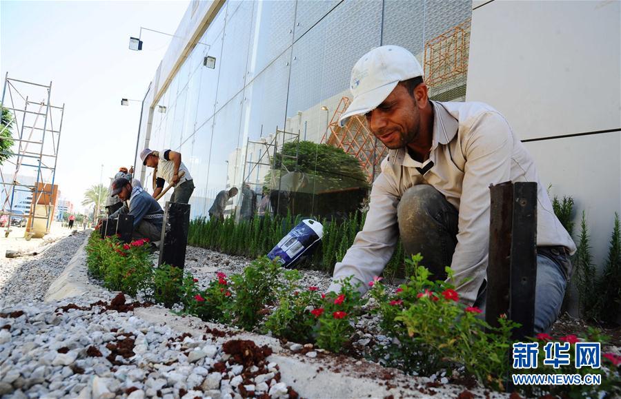 8月10日,在叙利亚首都大马士革,工人在大马士革国际博览会会场外种植花草。