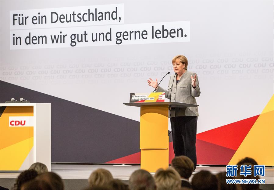 8月12日,在德国多特蒙德,德国总理默克尔在竞选集会上讲话。德国总理默克尔领导的基督教民主联盟(基民盟)12日在多特蒙德举行竞选集会,为即将于9月24日举行的联邦议会选举造势。新华社发(约阿希姆·毕瓦勒兹摄)