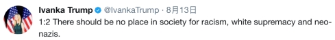 特朗普的女儿伊万卡,对此事的态度也十分鲜明。她通过社交媒体言辞激烈地谴责“种族歧视、白人至上主义和新纳粹”。她表示,这些思想在美国社会没有存在空间。