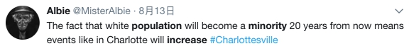 推特网友@Albie: 一个事实是白种族裔人口将在二十年内下降成为少数族裔。这意味着类似弗吉尼亚州这样的游行会越来越多。