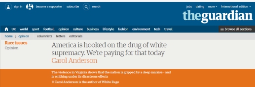 英国《卫报》发表文章“美国沉迷于白人至上主义毒瘾我们正在付出代价”指出,美国已经陷入混乱,白人至上主义者正在大步前进,他们的身后留下斑斑血迹和一片混乱。