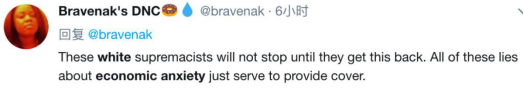 推特网友@Bravenak’s DNC: “白人至上”主义不会停止,直到白人拿回他们所谓的利益。把种族歧视归结于经济焦虑这样的的谎言只是为了给“白人至上”主义的发展提供掩护。