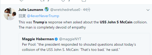 这就是特朗普在听到麦凯恩号的撞船事件后的反应…….这个人完全没有同情心啊。