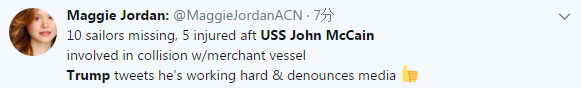 军舰被撞,10人失踪,5人受伤…….而特朗普却在发推显摆他在努力工作,并顺道谴责一下媒体。