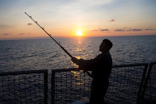官兵依栏垂钓。(图片来源:“麦凯恩”号官方社交网脸书)