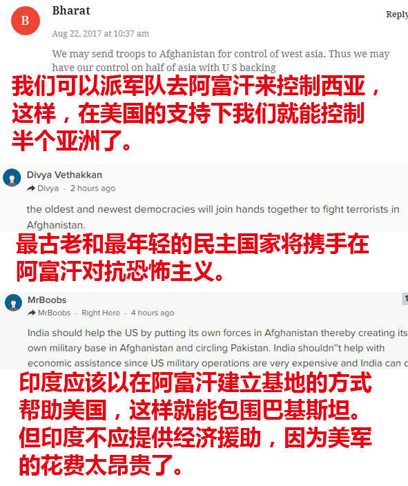 “印度,世界上最大的民主国家,是美国重要的安全和经济伙伴。”《印度时报》网站引用特朗普的原话称,美国总统向印度发出邀请。希望印度发挥更大作用,给阿富汗来带和平与稳定。
