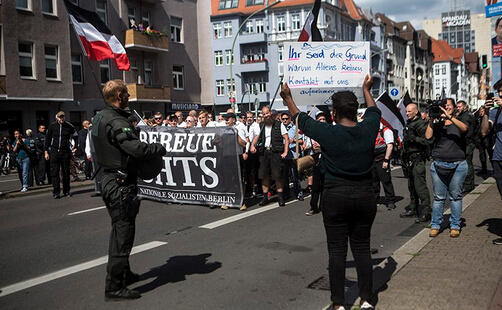 当时,500多名游行的新纳粹分子准备游行到柏林西区的施潘道(Spandau)监狱原址,赫斯当年就是在这所监狱去世的。报道称,游行队伍在通往目的地途中被左翼人士和当地居民阻挡住。