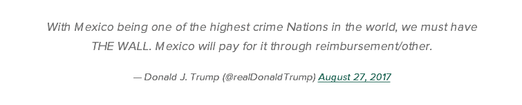 报道称,特朗普曾表示墨西哥是世界上犯罪率最高的国家之一,并多次提出了墨应支付边境墙修建费用的要求。墨西哥总统对此说法进行了驳斥。