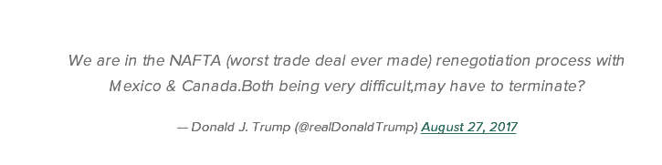 此外,特朗普27日曾在推特称,北美自由贸易协定“是历史上最糟糕的贸易协定”,并声明要终止这份协议。墨西哥外交部对此作出回应,强调墨方不会通过社交媒体重新谈判北美自由贸易协定,也不会商议双边关系的其他问题。