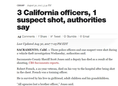 美国加州萨克拉门托县政府称,当地时间周三(30日),三名警官和一名嫌疑犯在交火中中枪身亡,当时警方正在调查一起偷车案件。据哥伦比亚广播公司报道,萨克拉门托县警长斯科特·琼斯(Scott Jones)称,一名县治安官死于枪战。21年警龄的资深警员罗伯特·弗兰茨(Robert French)胸部中弹,在送医途中不幸身亡。他在警队中担任培训官一职。他这一死,丢下了同居女友、已成年的孩子们以及年幼的孙子们。“大家失去了好兄弟,”琼斯说道。