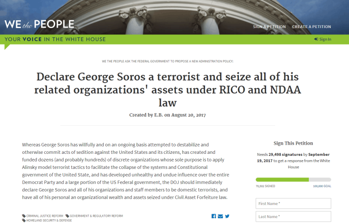 这份由E.B.于今年8月20日创建的请愿书,题为“宣布乔治·索罗斯为恐怖分子,依据RICO(《反诈骗腐败组织集团犯罪法》)和NDAA(《国防授权法》)法案,扣押和他相关的所有组织的资产!”截至环球网记者发稿,请愿书签名人数为70502人,且在不断上升。要想得到白宫的回复,需要在2017年9月19日前再收集到29498个签名,即超过10万人签名。