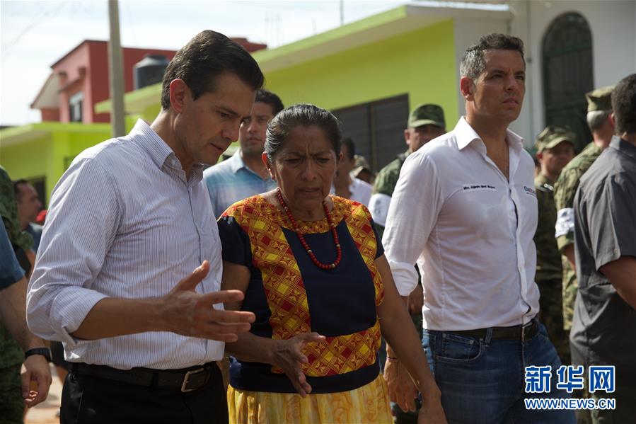 9月8日,在墨西哥瓦哈卡州,墨西哥总统培尼亚(左一)视察灾情。墨西哥9月7日晚发生强烈地震,遇难人数已上升至58人。墨西哥南部瓦哈卡州是受灾最严重的州。新华社记者 淡航 摄