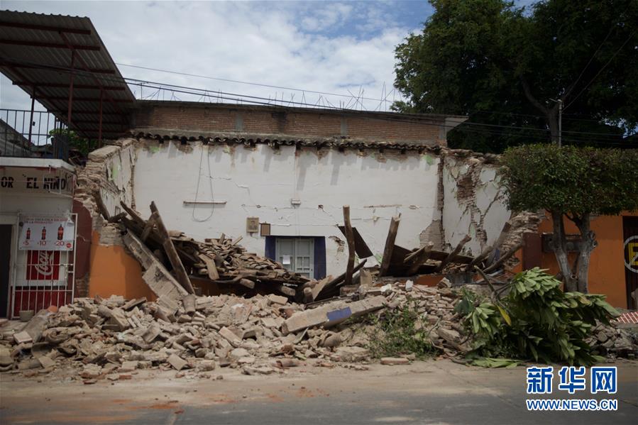 这是9月8日在墨西哥瓦哈卡州拍摄的一处在地震中受损的房屋。墨西哥9月7日晚发生强烈地震,遇难人数已上升至58人。墨西哥南部瓦哈卡州是受灾最严重的州。新华社记者 淡航 摄