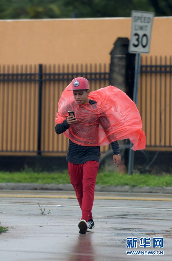 9月9日,在美国佛罗里达州迈阿密,一名男子冒雨行走。