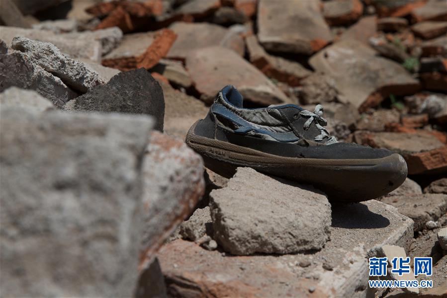 9月9日,在墨西哥瓦哈卡州胡奇坦市,一只童鞋遗落在亚伯拉罕家门口的废墟上。新华社记者淡航 摄