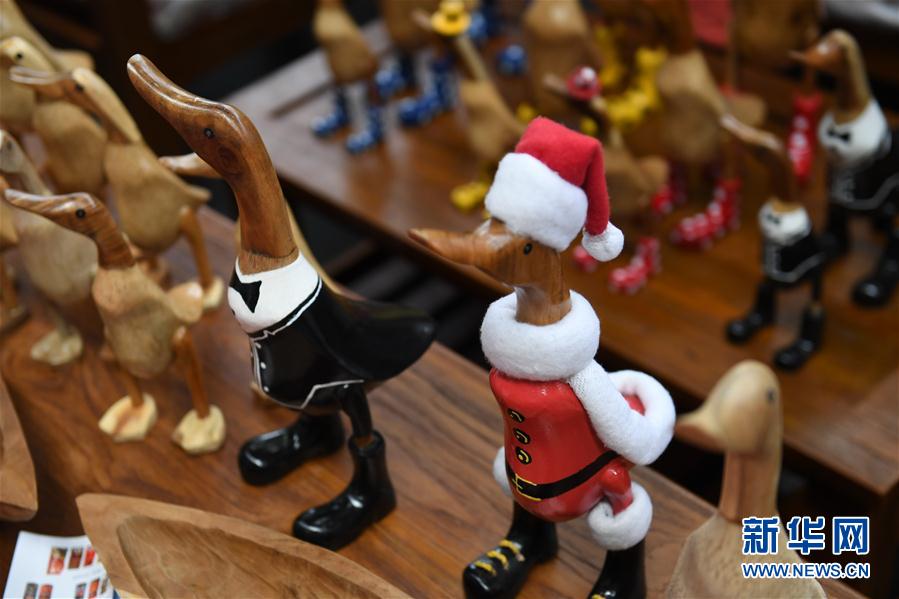 这是印度尼西亚展区的木雕鸭(9月13日摄)。正在广西南宁举办的第十四届中国—东盟博览会上,参展商展出的手工艺品做工精致,萌态可掬,备受观众青睐。新华社记者 周华摄