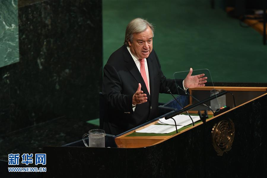 9月19日,在纽约联合国总部,联合国秘书长古特雷斯在联大一般性辩论上发言。第72届联合国大会一般性辩论19日在纽约联合国总部开始举行。新华社记者 李睿 摄