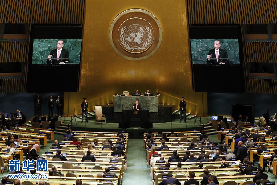 9月19日,在纽约联合国总部,土耳其总统埃尔多安在联大一般性辩论上发言。第72届联合国大会一般性辩论19日在纽约联合国总部开始举行。新华社记者 李木子 摄