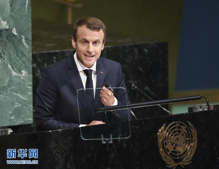 9月19日,在纽约联合国总部,法国总统马克龙在联大一般性辩论上发言。第72届联合国大会一般性辩论19日在纽约联合国总部开始举行。新华社记者 王迎 摄