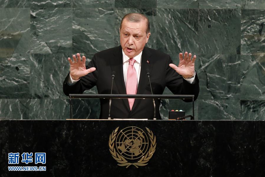 9月19日,在纽约联合国总部,土耳其总统埃尔多安在联大一般性辩论上发言。第72届联合国大会一般性辩论19日在纽约联合国总部开始举行。新华社记者 李木子 摄
