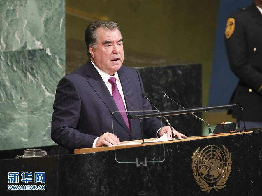 9月19日,在纽约联合国总部,塔吉克斯坦总统拉赫蒙在联大一般性辩论上发言。第72届联合国大会一般性辩论19日在纽约联合国总部开始举行。新华社记者 王迎 摄