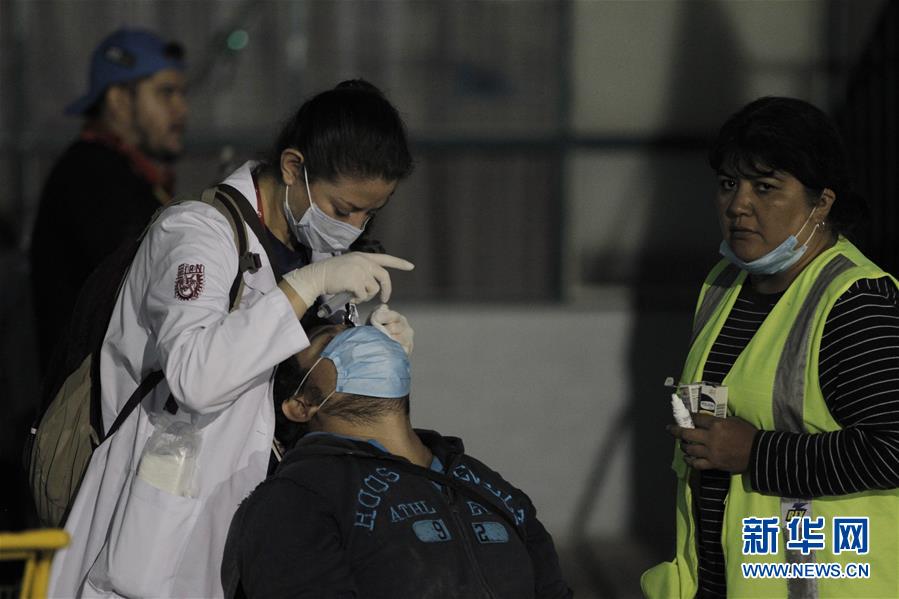 9月20日,在墨西哥首都墨西哥城玻利瓦尔街,医护人员为伤者治疗。墨西哥政府已调动军队等多方力量实施紧急救援。新华社记者淡航摄