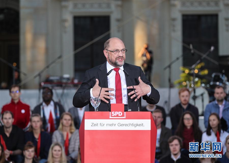 当日,德国社会民主党总理候选人舒尔茨出席在柏林举行的竞选集会,为将于9月24日举行的联邦议会选举最后冲刺。