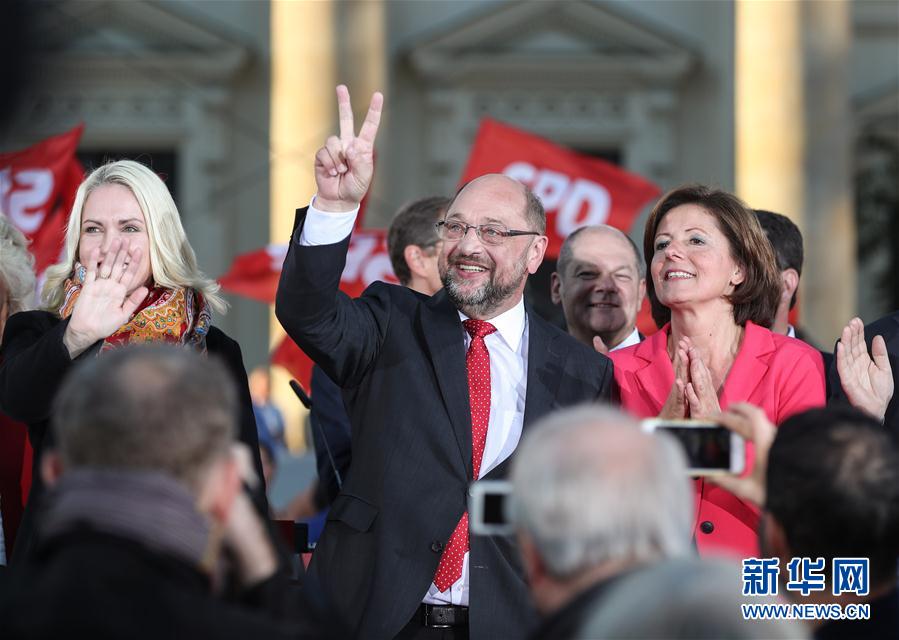 当日,德国社会民主党总理候选人舒尔茨出席在柏林举行的竞选集会,为将于9月24日举行的联邦议会选举最后冲刺。