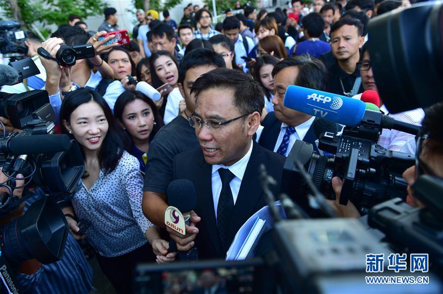 9月27日,英拉的律师诺拉维(中)在位于曼谷的泰国最高法院前接受媒体采访。泰国最高法院27日在被告前总理英拉不在场的情况下,宣判她涉及的大米收购案。法院认定英拉渎职、纵容腐败等罪名成立,依法判处其五年有期徒刑,且没有缓刑。新华社记者李芒茫摄
