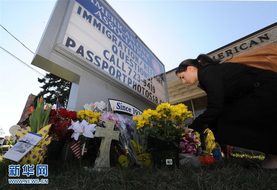 这是4月5日,一位女士在宾厄姆顿美国公民协会前献花,悼念枪击事件遇难者。新华社记者 申宏 摄