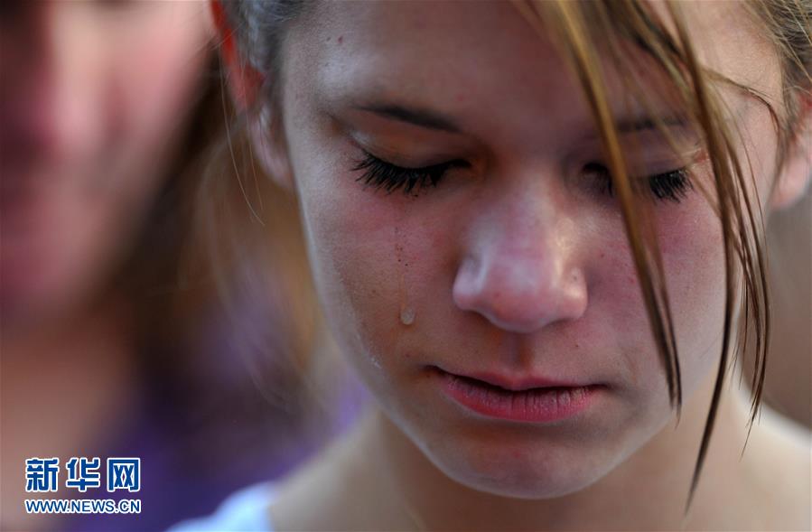 这是7月22日,一名女孩在纪念枪击案遇难者的仪式上伤心落泪。新华社记者 杨磊 摄