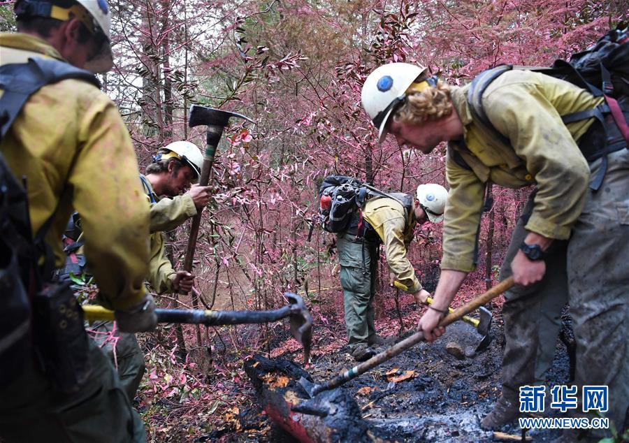 10月19日,在美国加利福尼亚州圣罗莎附近的火场,一队消防员在洒满阻燃剂的林间处理余烬。设在美国加利福尼亚州圣罗莎市附近的灭火指挥中心负责索诺马县全境以及纳帕县部分地区的山林大火灭火任务。据该指挥中心19日提供的数据,该地区有四个主要火场,面积共400多平方公里,80%的火场已被有效控制。新华社记者吴晓凌摄