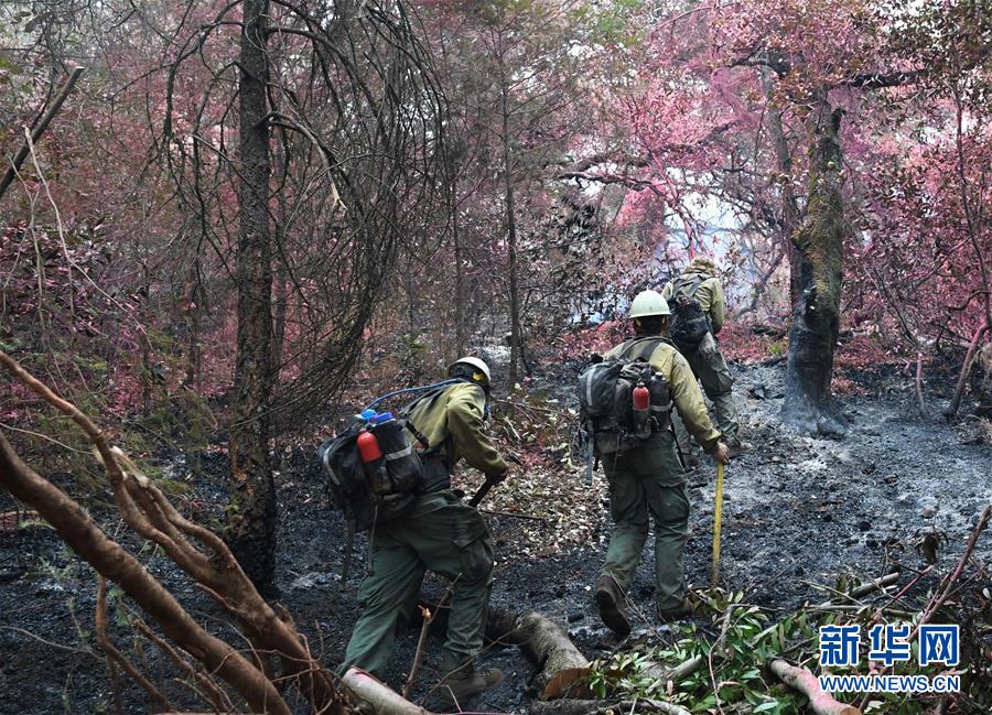 10月19日,在美国加利福尼亚州圣罗莎附近的火场,一队消防员在洒满阻燃剂的林间处理余烬。设在美国加利福尼亚州圣罗莎市附近的灭火指挥中心负责索诺马县全境以及纳帕县部分地区的山林大火灭火任务。据该指挥中心19日提供的数据,该地区有四个主要火场,面积共400多平方公里,80%的火场已被有效控制。新华社记者吴晓凌摄