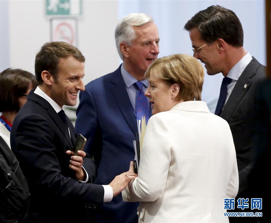 10月20日,在位于比利时布鲁塞尔的欧盟总部,法国总统马克龙、欧盟“脱欧”首席谈判代表米歇尔·巴尼耶、德国总理默克尔与荷兰首相吕特(从左至右)在会议前交谈。欧盟27国领导人20日在布鲁塞尔宣布,将在欧盟理事会(除英国)以及谈判团队内部启动“脱欧”第二阶段谈判的准备讨论工作。新华社记者叶平凡 摄