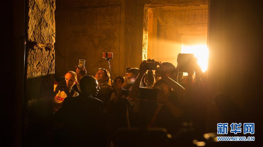 10月22日,在埃及南部阿斯旺省,游客在日光节期间参观阿布·辛拜勒神庙。每年2月21日和10月21日被称作“日光节”,这两天是古埃及第19王朝第三代国王拉美西斯二世的诞辰日和登基日。日光节来临时,阿布·辛拜勒神庙内室圣坛上的太阳神阿蒙、被神化的拉美西斯二世和下埃及神胡拉赫提雕像会依次被朝阳的光束照亮。神庙于上世纪60年代经历了一次工程浩大的搬迁后,由于地势下沉等原因,每年“日照圣殿”奇观到来的时间都推迟了一天,日光节也就因此推迟至2月22日和10月22日两天举行。新华社记者孟涛摄