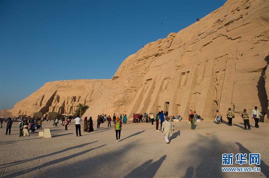 10月22日,在埃及南部阿斯旺省,游客在日光节期间参观阿布·辛拜勒神庙。每年2月21日和10月21日被称作“日光节”,这两天是古埃及第19王朝第三代国王拉美西斯二世的诞辰日和登基日。日光节来临时,阿布·辛拜勒神庙内室圣坛上的太阳神阿蒙、被神化的拉美西斯二世和下埃及神胡拉赫提雕像会依次被朝阳的光束照亮。神庙于上世纪60年代经历了一次工程浩大的搬迁后,由于地势下沉等原因,每年“日照圣殿”奇观到来的时间都推迟了一天,日光节也就因此推迟至2月22日和10月22日两天举行。新华社记者孟涛摄