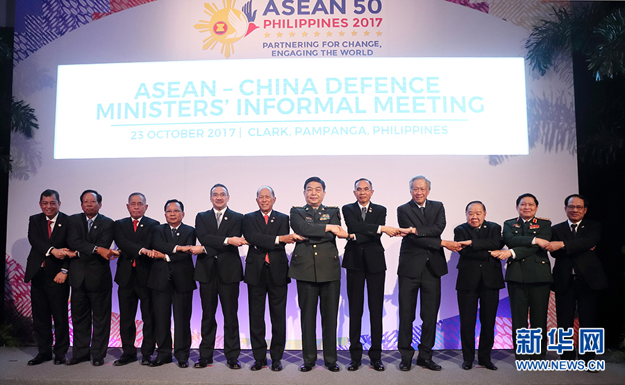 10月23日,在菲律宾克拉克,出席第七次中国-东盟防长非正式会晤的各国防长合影。第七次中国-东盟防长非正式会晤23日下午在菲律宾克拉克举行,国务委员兼国防部长常万全与东盟10国防务部门领导人共同出席。新华社发