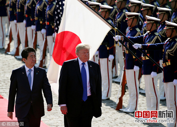 当地时间2017年11月6日,日本东京,日本首相安倍晋三与美国总统特朗普举行正式会晤。(Koji Sasahara/视觉中国)