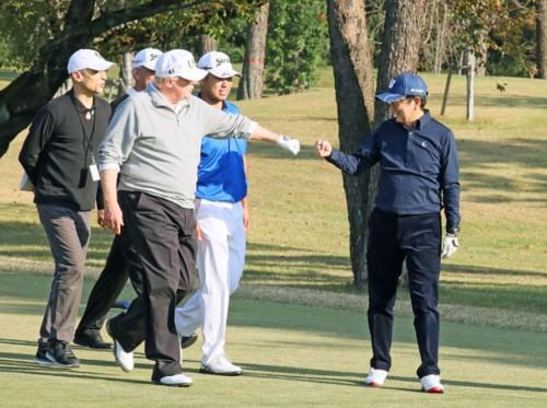 5日,特朗普和安倍晋三在2020年东京奥运会高尔夫比赛场地、日本埼玉县川越市霞关乡村俱乐部共进午餐。随后,两人换上高尔夫球衣,与全球排名第4的高日本尔夫球职业选手松山英树在场一起挥杆,借此增进与特朗普的个人信赖关系。期间两人在绣着“Make alliance even greater”(译为“让美日同盟更伟大”)字样的帽子上签名,松山英树也在帽子上签了名,这也被视为安倍送给特朗普的纪念品之一。(海外网张敏)