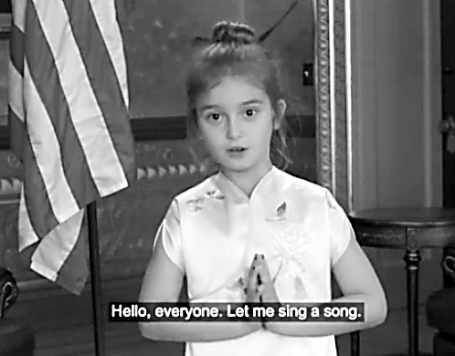 “我们的田野,美丽的田野,碧绿的河水,流过无边的稻田……”8日,美国总统特朗普在访问中国首日用平板电脑展示外孙女阿拉贝拉用中文表演节目的视频。视频中,身穿中国旗袍的阿拉贝拉首先向中国国家主席习近平夫妇问好,然后演唱包括《我们的田野》在内的著名中文歌曲,接着她还背诵了《三字经》和唐诗《望庐山瀑布》以及《早发白帝城》。萌萌的童音俘获了亿万中国网民的心。