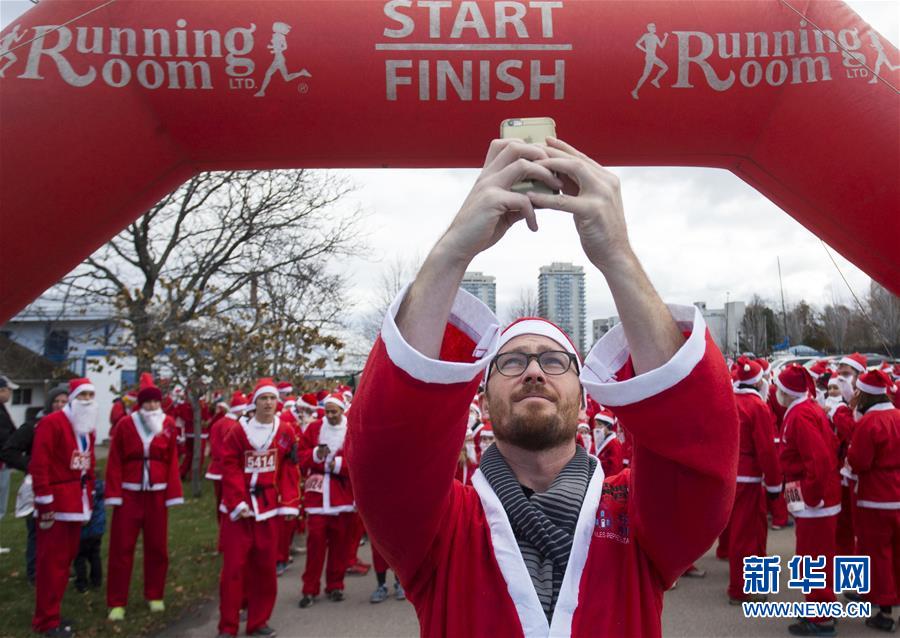 11月19日,在加拿大安大略省汉密尔顿市,一名身着圣诞老人服装的参赛者在比赛前自拍。当日,加拿大汉密尔顿市举办了一年一度的圣诞老人五公里跑比赛,吸引了500余名参赛者参加。新华社发(邹峥摄)