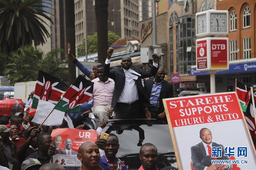 11月20日,朱比利党支持者在肯尼亚首都内罗毕的最高法院外庆祝。肯尼亚最高法院20日裁定10月26日举行的总统重新选举结果有效,朱比利党总统候选人、现任总统乌胡鲁·肯雅塔在选举中获胜。新华社发(弗雷德摄)