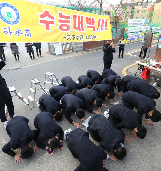 开考前,高一高二学生磕头祝前辈考试顺利