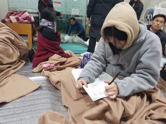 15日,韩国高考生在避难场所熬夜复习