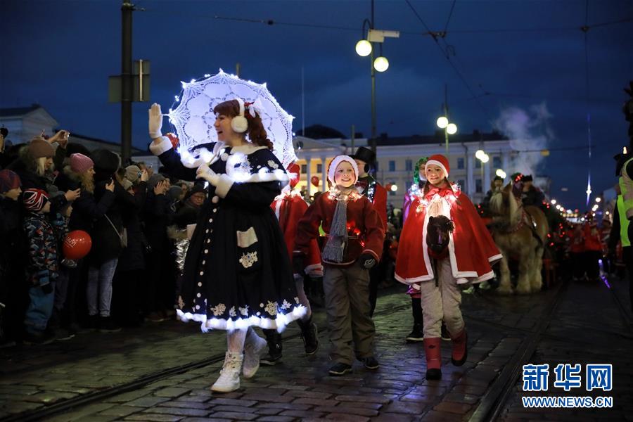 11月26日,在芬兰赫尔辛基,人们在圣诞大街上参加游行。