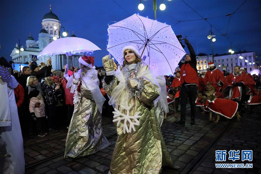 11月26日,在芬兰赫尔辛基,人们在圣诞大街上参加游行。