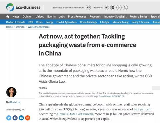 Eco-Business网站忍不住刊文点赞中国应对快递包装垃圾的努力,还贴心建议政府部门、快递及回收行业、消费者要牵起手来,一起促成中国绿色快递的快速实现。