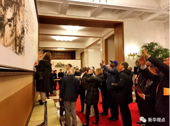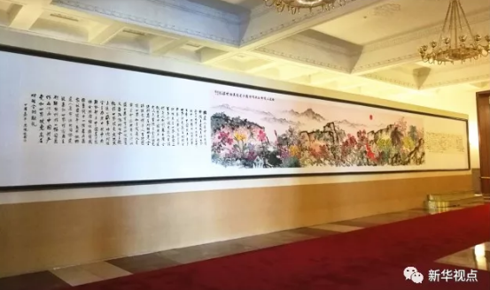 当参会嘉宾自北门步入大会堂时,正对面的一幅巨型国画格外引人注意。这幅画左上角的名字大气磅礴——《构建人类命运共同体、建设美好世界》。参会嘉宾驻足观看,并在右侧留白处签字。